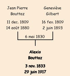 Mère : Geneviève Gilbert, fille de Michel | Marraine : Séraphine Augert (épouse de Saturnin Bouttaz) |
