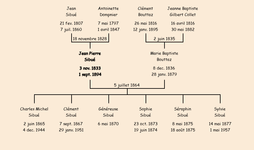 Epoux : Jean Pierre Sibué (30 ans, né le 3 novembre1833, cultivateur à la Bise, a signé), fils de Jean (décédé le 7 juillet1860) et de Marie Antoinette Dompnier (décédée le 1er avril1847) |