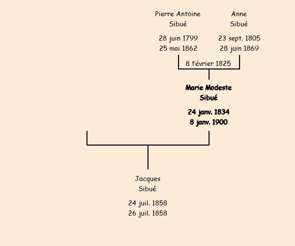 Père : Pierre Antoine Sibué, fils de Jean Baptiste | Parrain : Isidore Sibué (fils de Pierre Antoine décédé) |