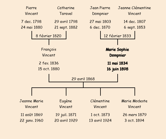 Epouse : Marie Sophie Dompnier (33 ans, née le 11 mai1834, de La Maison Blanche, cultivatrice, a signé), fille de Jean Pierre (cultivateur, a signé) et de Jeanne Clémentine Vincent (décédée le 6 septembre1853) |