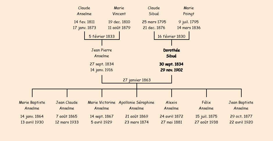 Témoins : Antoine Sibué 58 ans laboureur fils Michel décédé, oncle de l'épouse, Alexis Sibué 32 ans agriculteur fils de Claude et frère de l'épouse, Séraphin Vincent 28 ans laboureur fils de Jean Claude et cousin de l'époux et Georges Crinel fils Michel décédé, 26 ans beau frère de l'époux |
