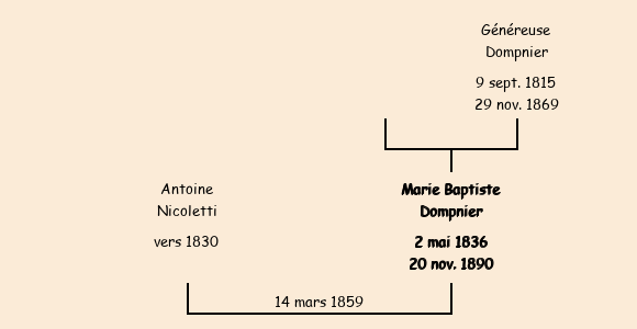 Au décès de sa mère Généreuse (1869) le premier déclarant est son gendre Antoine Nicolotti entrepreneur de travaux publiques à Saint-Jean-de-Maurienne 41 ans qui pourrait être l'époux de Marie Baptiste. Second déclarant Pierre Lambert gendre de Généreuse Dompnier qui est l'époux de de Justine Dompnier (et il n'y a que 2 filles dans les enfants de Généreuse) |