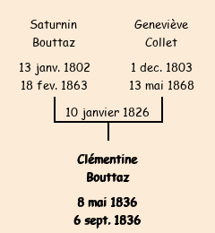 | Père : Saturnin Bouttaz, fils de Charles | Parrain : Charles Bouttaz (frère de la baptisée) |