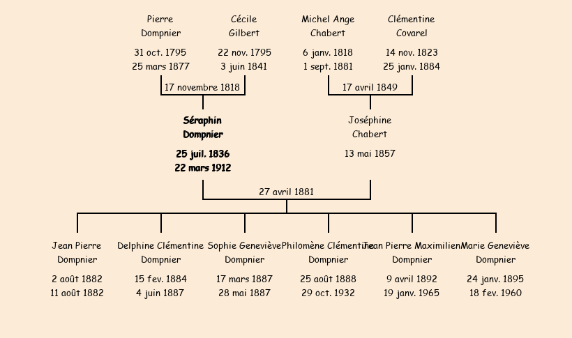Epoux : Séraphin Dompnier (45 ans, né le 25 juillet1836, cultivateur au ChefLlieu, a signé), fils de feu Pierre et de Cécile Gilbert (décédée 3 juin1841) |