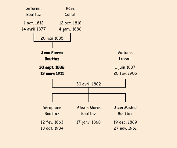 | Père : Saturnin Bouttaz, fils de Jean Michel | Parrain : Jean Pierre Bouttaz (oncle du baptisé) |