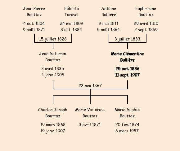 Père : Antoine Bullière, fils de Jean Pierre | Parrain : Jean Pierre Bouttaz (fils de Jean Baptiste) |