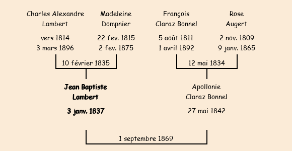 Epoux : Jean Baptiste Lambert (32 ans, né le 3 janvier 1837, cultivateur au Rosayt, a signé), fils de Alexandre (cultivateur, a signé) et de Madeleine Dompnier (cultivatrice, n'a pas su signer) |