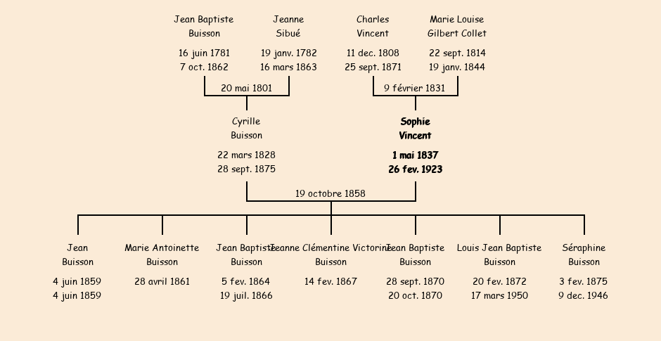 Mariée (21 ans) avec Cyrille Buisson (30 ans) le 19 octobre 1858 à Fontcouverte ![]() |