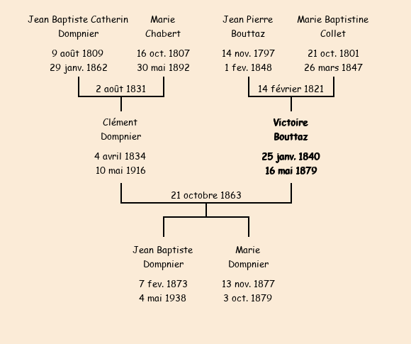 Témoins : Clément Bouttaz 36 ans laboureur fils de Jean Pierre décédé, frère de l'épouse, Jean Baptiste Bouttaz 32 ans agriculteur fils de Jean Pierre décédé, frère de l'épouse, Jean Saturnin Bouttaz 30 ans cultivateur fils de Jean Pierre décédé, frère de l'épouse et Alexandre Dominjon 33 ans fils de Pierre Antoine, laboureur oncle maternel de l'époux |