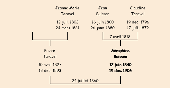 Epouse : Séraphine Buisson (20 ans, a marqué), fille de Jean (a signé) et de Claudine Taravel |