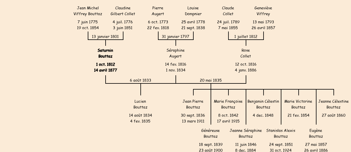 Epoux : Saturnin Bouttaz, fils de Jean Michel et de Jeanne Marie Gilbert Collet |