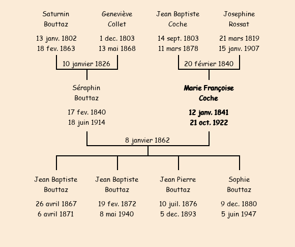 Mariée (20 ans) avec Séraphin Bouttaz (21 ans) le 8 janvier 1862 à Fontcouverte ![]() |