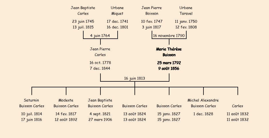 Epouse : Marie Thérèse Buisson, fille de Jean Pierre et de Albane Taravel (décédée. Erreur de nom Miquet dans l'acte) |
