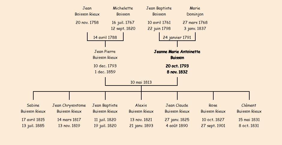 Epouse : Jeanne Marie Antoinette Buisson, fille de feu Jean Baptiste et de Marie Dominjon |