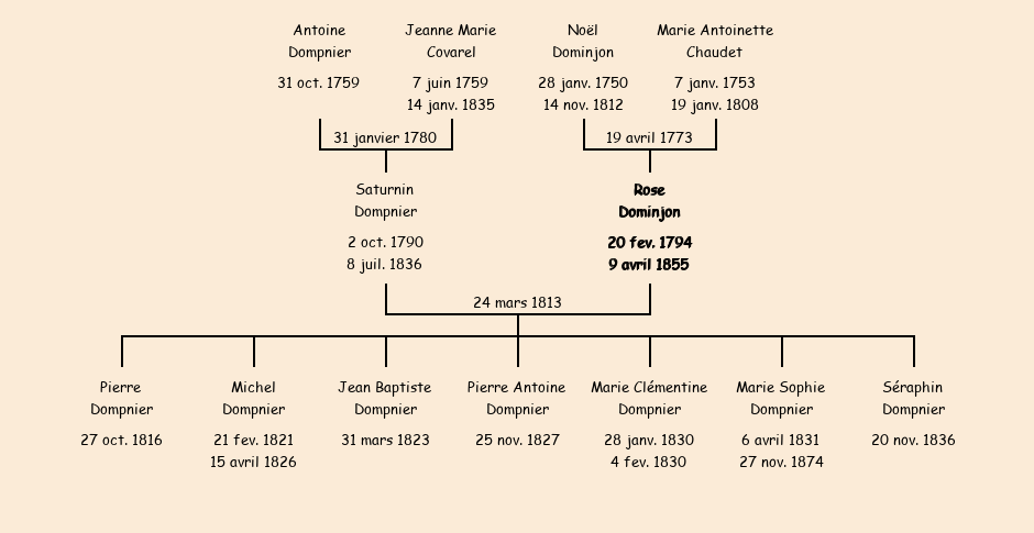 Mère : Marie Antoinette Chaudet | Marraine : Rose Dominjon (fille de Sébastien) |