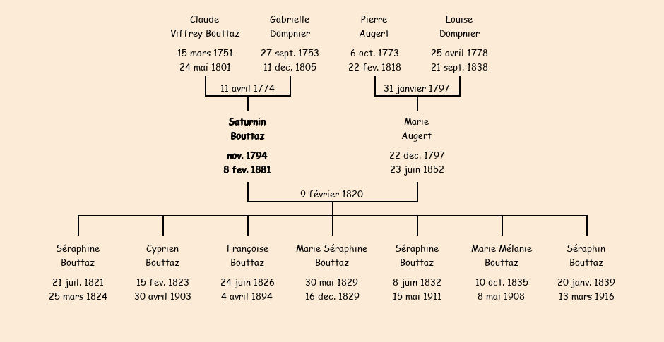 | Epoux : Saturnin Bouttaz, fils de feu Claude et de Gabrielle Dompnier |