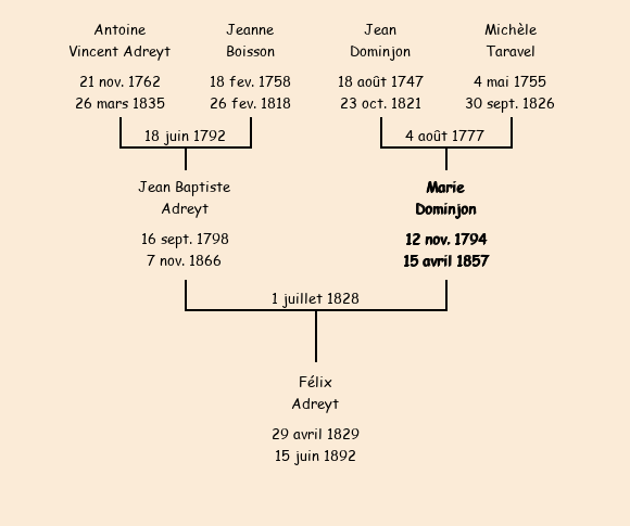 Epouse : Marie Dominjon, fille de feu Jean et de feue Michèle Taravel |