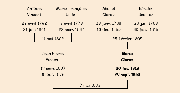 Mère : Rose Bouttaz, fille de Pierre Antoine | Marraine : Catherine Claraz (soeur du père) |