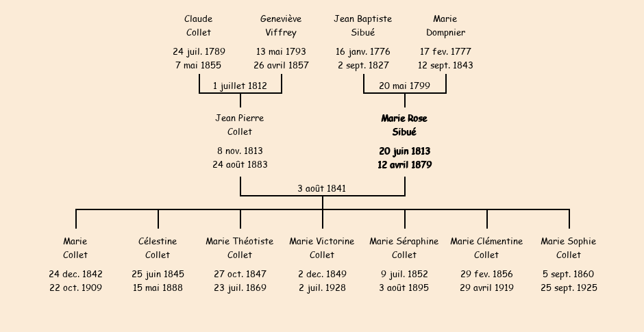 Epouse : Marie Rose Sibué (28 ans, a marqué), fille de feu Jean Baptiste et de Marie Dompnier (a marqué) |
