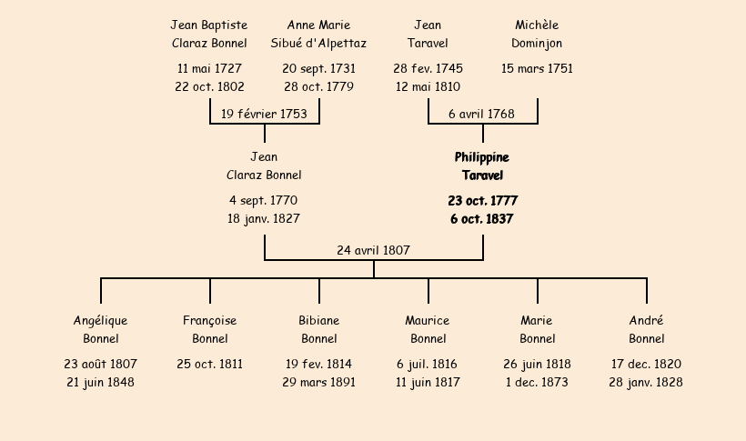 Mariée (29 ans) avec Jean Claraz Bonnel (36 ans) le 24 avril 1807 à Fontcouverte ![]() |