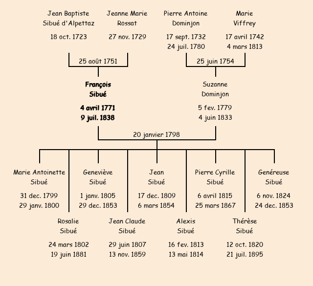 Epoux : François Sibué (soldat au Piemont dans l'armée du Roi de Sardaigne depuis trois ans et quelques mois, autorisation de mariage), fils de feu Jean Baptiste et de feue Jeanne Marie Rossat |