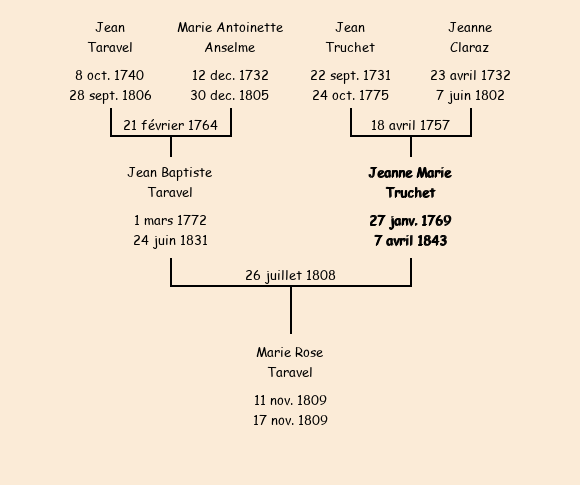 Epoux : Jean Baptiste Taravel (veuf de Jeanne Gilbert), fils de feu Jean et de Marie Antoinette Anselme |