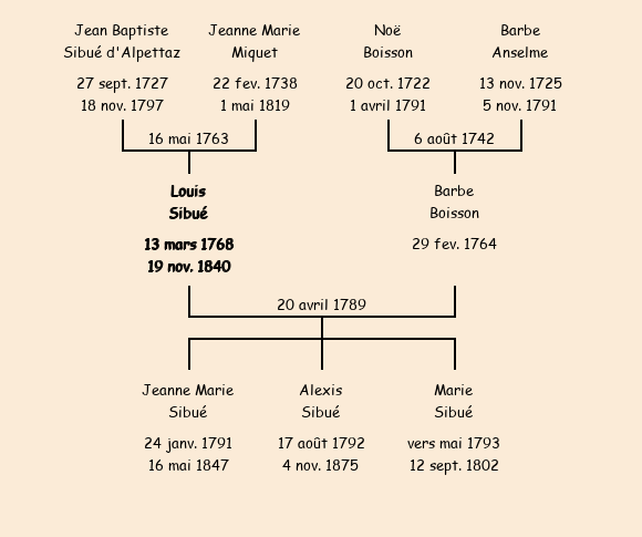 Epoux : Louis Sibué, fils de Jean Baptiste (le jeune) et de Jeanne Marie Miquet |