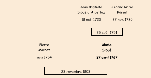 Mariée (36 ans) avec Pierre Marcoz (49 ans) le 23 novembre 1803 à Saint-Jean-de-Maurienne |
