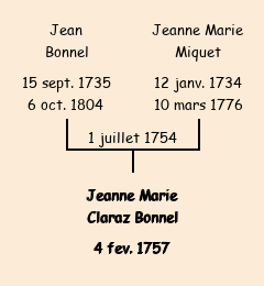 Mère : Jeanne Miquet | Marraine : Jeanne Marie Claraz Bonnel (fille du parrain) |