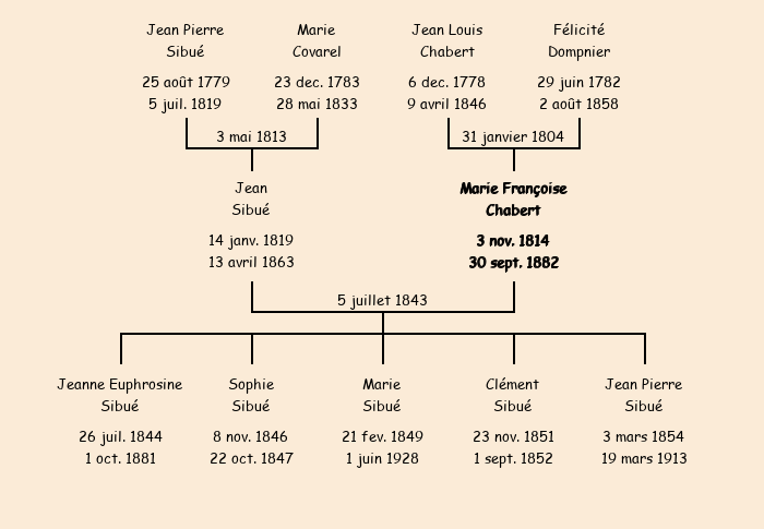 Mariée (28 ans) avec Jean Sibué (24 ans) le 5 juillet 1843 à Fontcouverte ![]() |