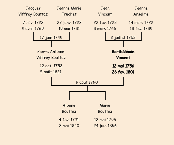 Epoux : Pierre Antoine Viffrey Bouttaz, fils de feu Jacques et de feue Jeanne Marie Truchet |