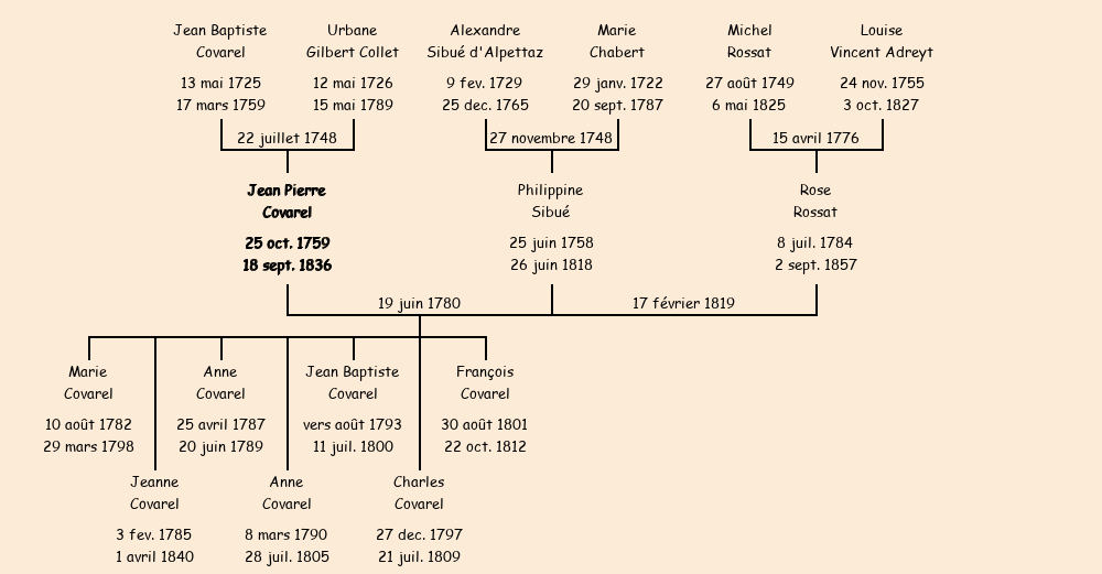 Epoux : Jean Pierre Covarel (veuf de Philippine Sibué), fils de feu Jean Baptiste et de Urbaine Gilbert |