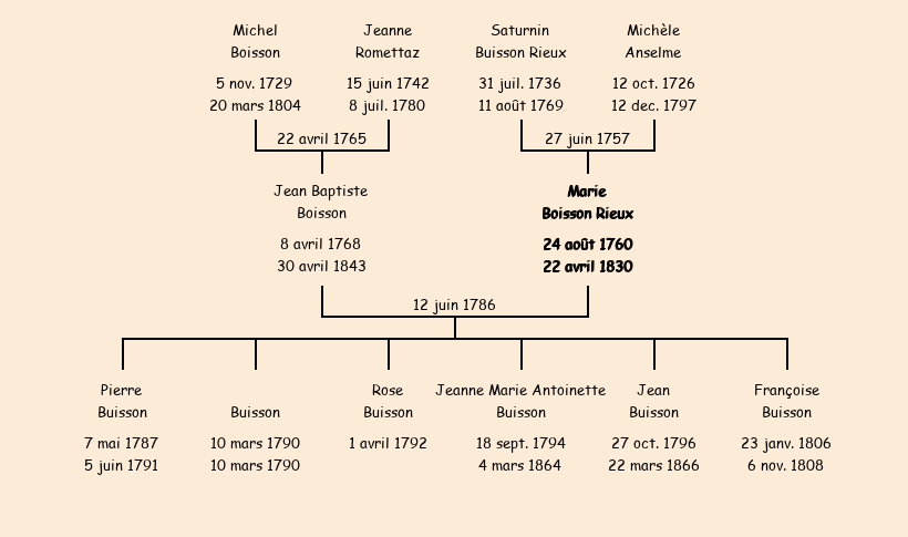 Mariée (25 ans) avec Jean Baptiste Boisson (18 ans) le 12 juin 1786 à Fontcouverte ![]() |