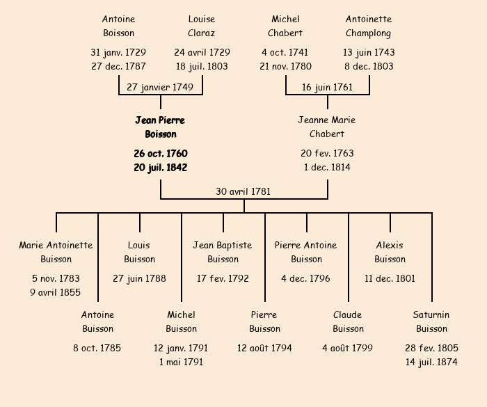 Epoux : Jean Pierre Buisson, fils de Antoine et de Louise Claraz |