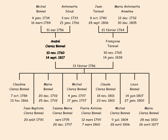 Epoux : André Claraz Bonnel, fils de feu Michel et de Antoinette Sibué |