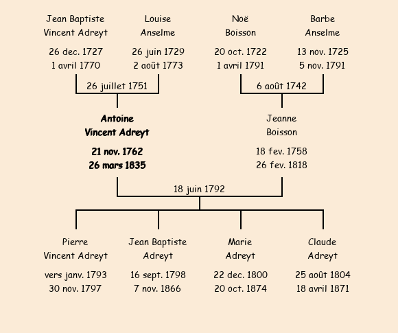 Epoux : Antoine Vincent Adreyt, fils de feu Jean Baptiste et de Louise Anselme |