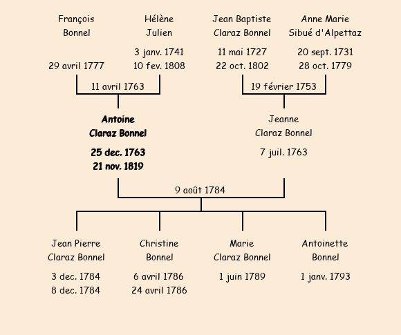 Epoux : Antoine Claraz Bonnel, fils de feu François et de Hélène Julien |