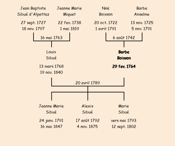 Epoux : Louis Sibué, fils de Jean Baptiste (le jeune) et de Jeanne Marie Miquet |