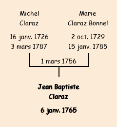 | Mère : Marie Claraz Bonnel | Marraine : Anne Taravel (veuve de Jean Baptiste Claraz) |