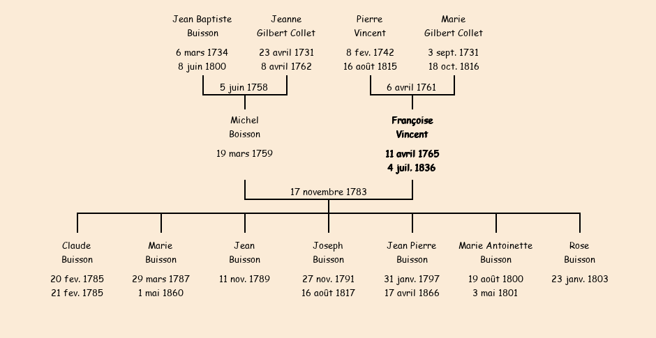 Epoux : Michel Buisson, fils de Jean Baptiste et de feue Jeanne Gilbert |
