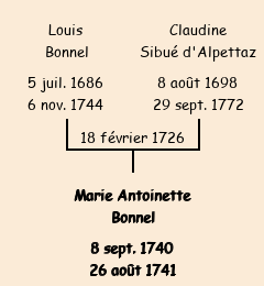 Mère : Claudine Sibué d'Alpettaz | Marraine : Marie Antoinette Bonnel (fille de Dominique) |