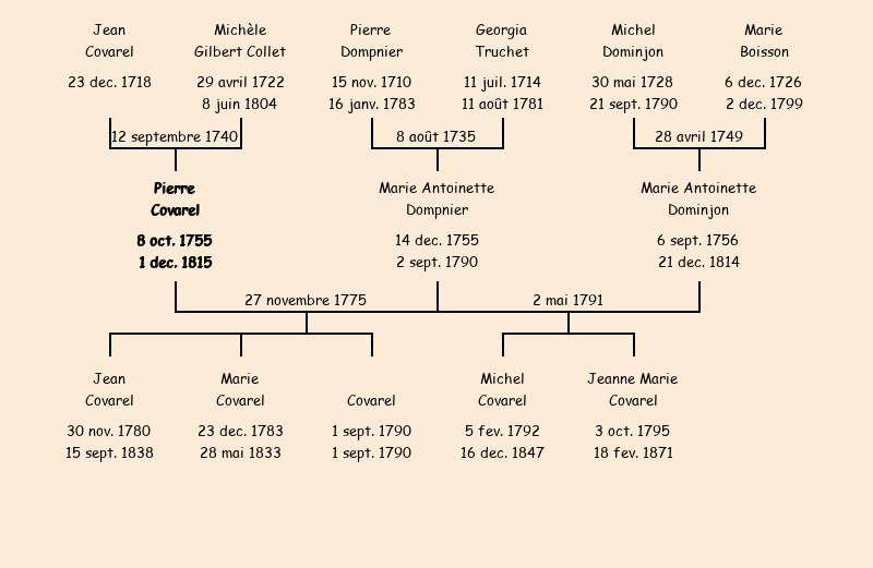 Epoux : Pierre Covarel (veuf de Marie Antoinete Dompnier fille de Pierre Dompnier), fils de feu Jean et de Michèle Collet |