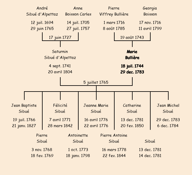 Mariée (20 ans) avec Saturnin Sibué d'Alpettaz (23 ans) le 5 juillet 1765 à Fontcouverte ![]() |