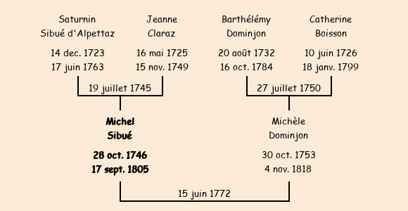 Marié (25 ans) avec Michèle Dominjon (18 ans) le 15 juin 1772 à Fontcouverte ![]() |