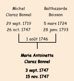 Père : Michel Claraz Bonnel | Parrain : Georges Claraz Bonnel (fils de Benoît décédé, frère de la marraine) |