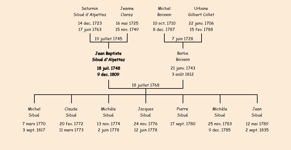 Père : Saturnin Sibué d'Alpettaz | Parrain : Jean Baptiste Sibué d'Alpettaz (fils de Saturnin décédé) |