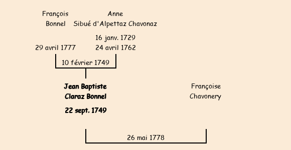 Marié (28 ans) avec Françoise Chavonery le 26 mai 1778 à Saint-Jean-de-Maurienne |