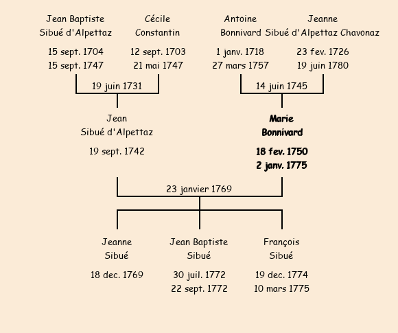 Mariée (18 ans) avec Jean Sibué d'Alpettaz (26 ans) le 23 janvier 1769 à Fontcouverte ![]() |