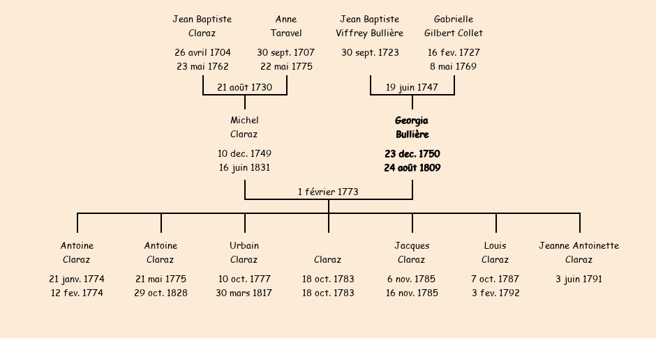 Epoux : Michel Claraz, fils de feu Jean Baptiste et de Anne Taravel |