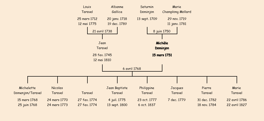 Mariée (17 ans) avec Jean Taravel (23 ans) le 6 avril 1768 à Fontcouverte ![]() |